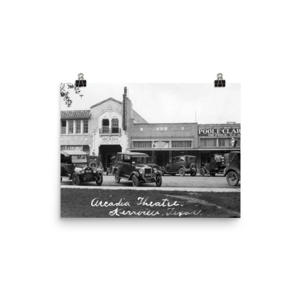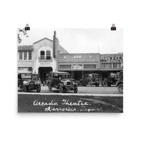 Kerrville's Arcadia Theater, taken not long after it was built in 1926. These matte, museum-quality posters are printed in the USA on durable, archival paper.