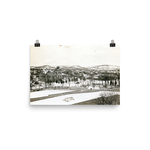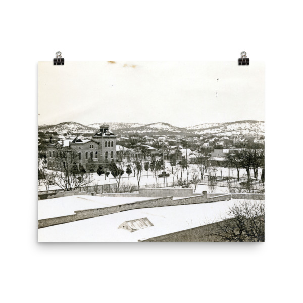 In February, 1923, snow fell upon Kerrville, and a photographer climbed the St Charles Hotel to snap this photo. The large building on the left is the third Kerr County courthouse, built in 1886. These matte, museum-quality posters are printed in the USA on durable, archival paper.