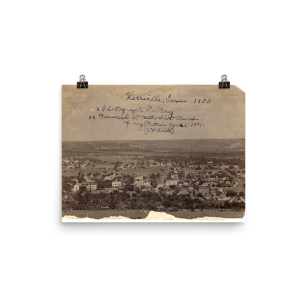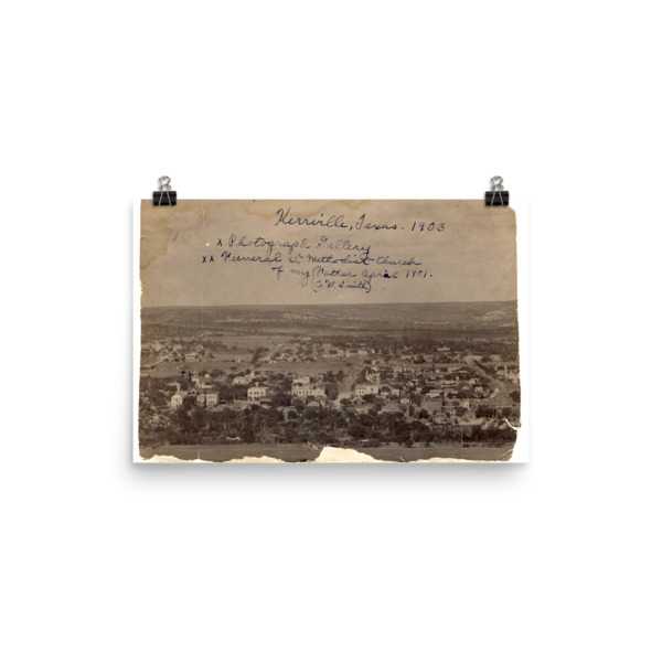This photograph taken by Smith in 1903 was taken from a hill south of the Guadalupe River looking north. It's a wonderful early image of town. These matte, museum-quality posters are printed in the USA on durable, archival paper.
